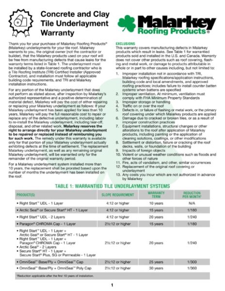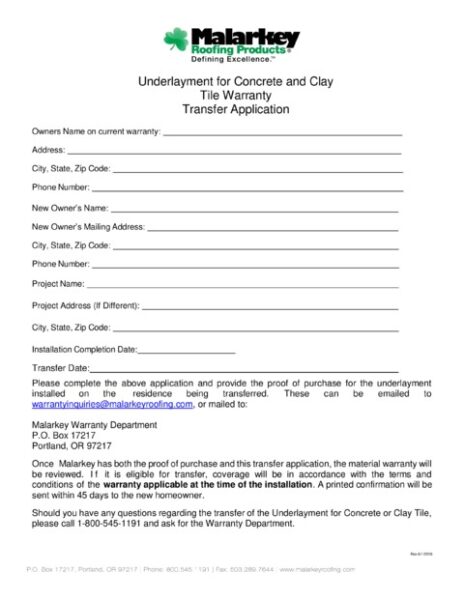 Concrete and Clay Tile Underlayment Warranty Transfer Application