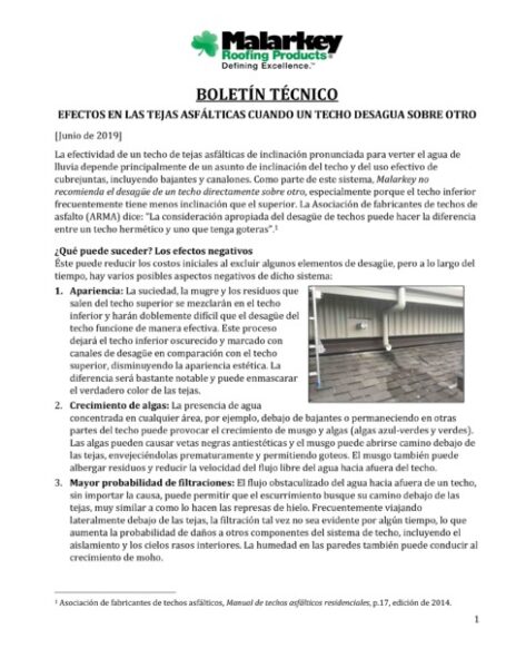 Boletín Técnico: Efectos en las Tejas Asfálticas Cuando un Techo Desagua Sobre Otro (Español)