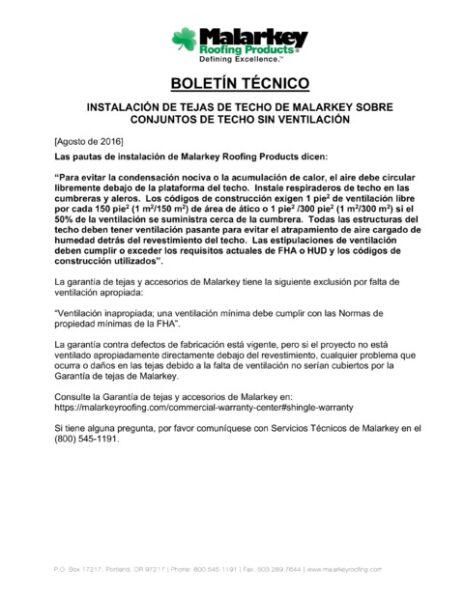 Boletín Técnico: Instalación de Tejas de Techo de Malarkey Sobre Conjuntos de Techo Sin Ventilación (Español)