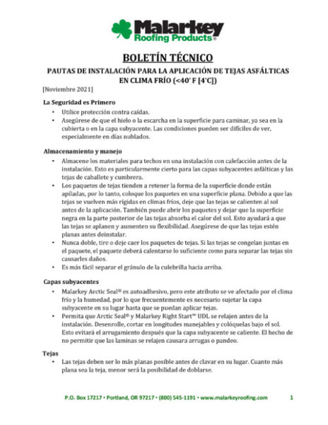 Boletín Técnico: Pautas de Instalación para la Aplicación de Tejas Asfálticas en Clima Frío (<40° F [4°C]) (Español)