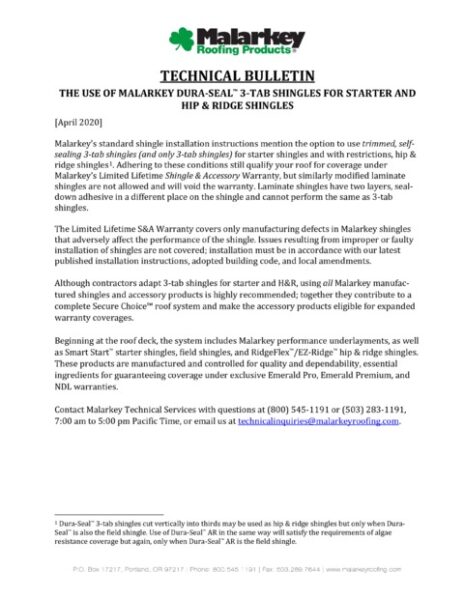 Technical Bulletin: The Use of Malarkey Dura-Seal 3-Tab Shingles for Starter and Hip & Ridge Shingles