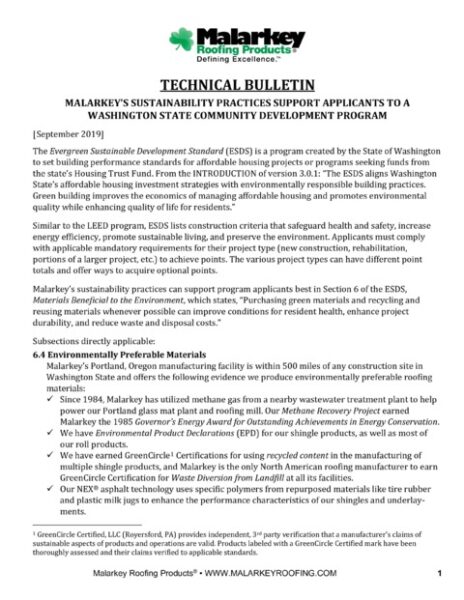 Technical Bulletin: Malarkey's Sustainability Practices Support Applicants to a Washington State Community Development Program