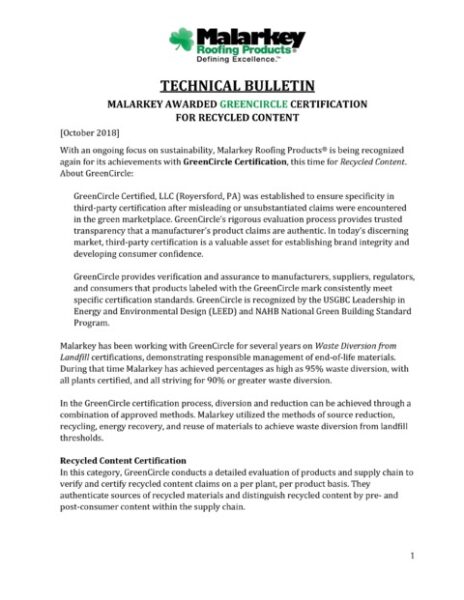 Technical Bulletin: Malarkey Awarded GreenCircle Certification for Recycled Content