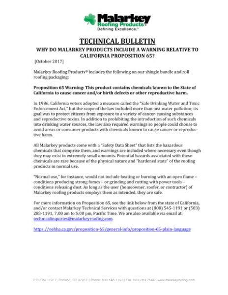 Technical Bulletin: Why Do Malarkey Products Include a Warning Relative to California Proposition 65?