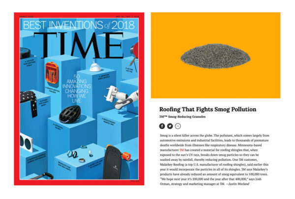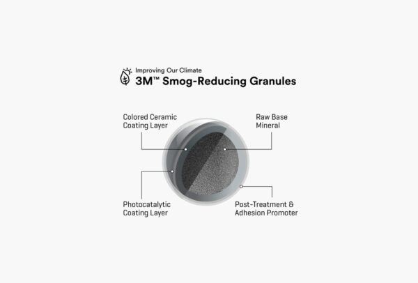 All Malarkey shingles include 3M™ Smog-Reducing Granules. These granules, which blend inconspicuously into the shingle’s color, contain a photocatalytic coating which, when activated by the UV rays of the sun, creates the energy needed to break-apart airborne water molecules (like from humidity) into their component parts (i.e., H20 breaks into H and OH).