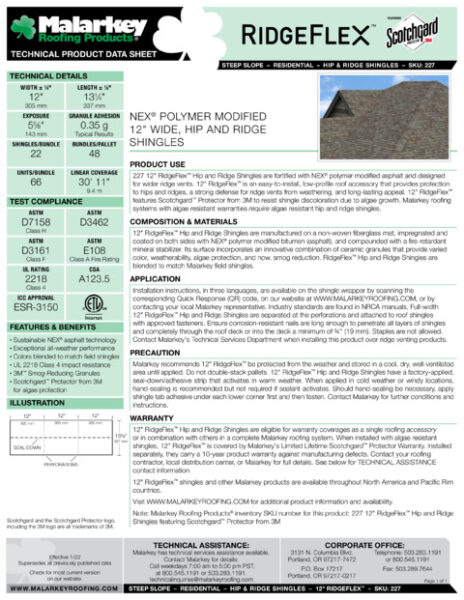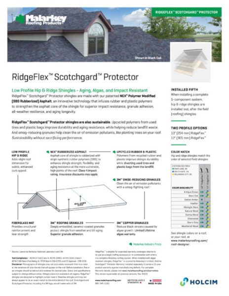 RidgeFlex™ is eligible for expanded warranty coverages relative to its use as a single roofing accessory or in combination with others in a complete Malarkey roofing system. When installed with algae resistant shingles, RidgeFlex™ is covered by Malarkey’s Limited Lifetime Scotchgard™ Protector Warranty. Installed separately, it carries a 10-year product warranty against manufacturing defects. Contact Malarkey’s Technical Services Department for details.