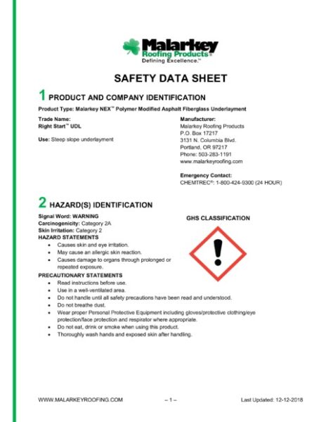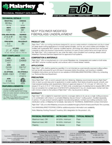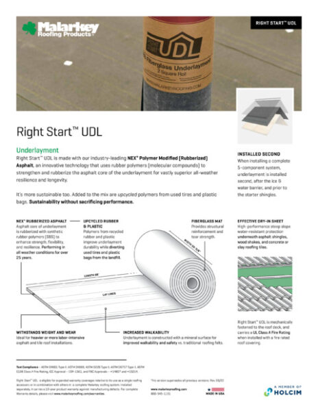 Right Start™ UDL is eligible for expanded warranty coverages relative to its use as a single roofing accessory or in combination with others in a complete Malarkey roofing system. Installed separately, it carries a 10-year product warranty against manufacturing defects. Contact Malarkey’s Technical Services Department for details.