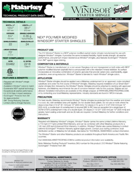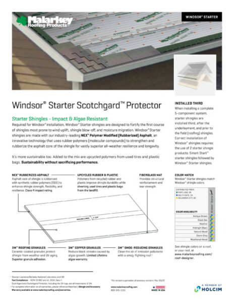 Required with Malarkey Windsor® shingles, Windsor® Starter carries the same Limited Lifetime Warranty, a 110 mph (177 kph) Limited Wind Warranty, and can be combined with other Malarkey products for a 140 mph (225 kph) Enhanced Wind Warranty. In addition, Windsor® Starter also carries Malarkey’s Limited Lifetime Scotchgard™ Protector Warranty against algae growth. Contact Malarkey’s Technical Services Department for details.
