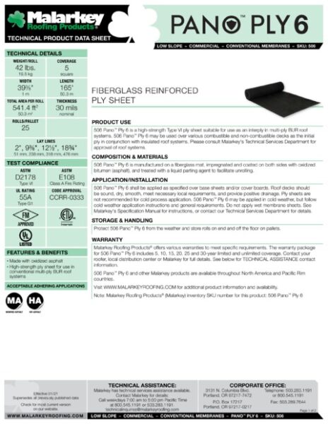 Malarkey Roofing Products® offers various warranties to meet specific requirements. The warranty packages available for systems using 506 Pano™ Ply 6 include 10, 15, 20, 25, and 30-year limited and unlimited coverage. Contact Malarkey’s Technical Services Department for approval of roof systems.