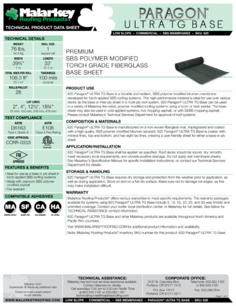 Malarkey Roofing Products® offers various warranties to meet specific requirements. The warranty packages available for systems using 620 Paragon® ULTRA TG Base include 10, 15, 20, 25, and 30-year limited and unlimited coverage. Contact Malarkey’s Technical Services Department for approval of roof systems.