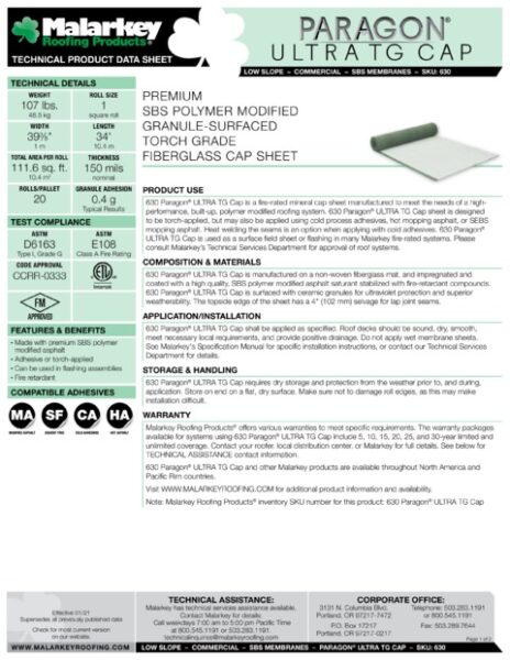 Paragon® ULTRA TG Cap is a modified asphalt sheet that can be used with a base sheet or ply sheet to create a 2-4 layer multi-ply system that meets desired performance, cost, and warranty needs.