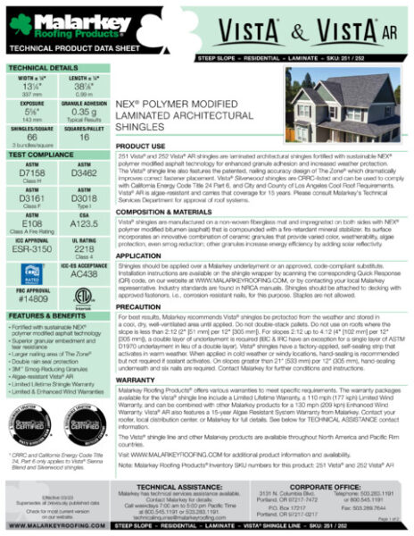 Designed in the popular architectural style, and made with our industry-leading NEX® Rubberized Asphalt, Vista® AR (algae-resistant) shingles deliver excellent all-weather resilience, a Class 4 hail impact rating, and include granules that help clean the air of emission pollutants.