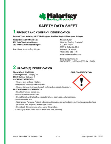 Vista & Vista AR Safety Data Sheet