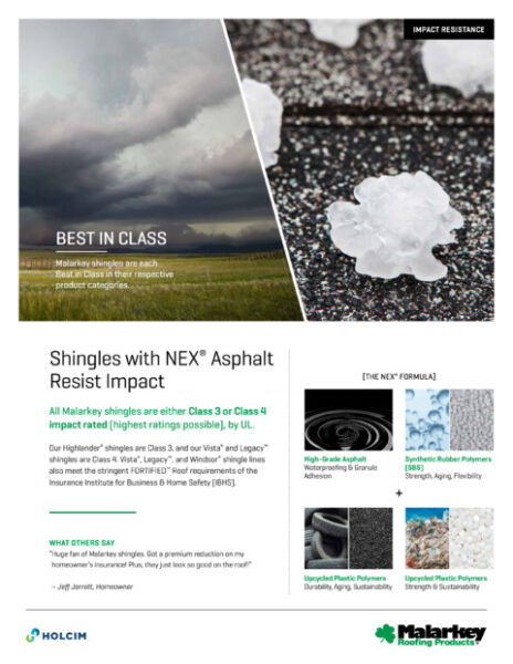 Made with our proprietary NEX® Polymer Modified (Rubberized) Asphalt, which combines asphalt for weathering, with rubber and plastic polymers for added strength and durability, Malarkey shingles are engineered to outperform and outlast.